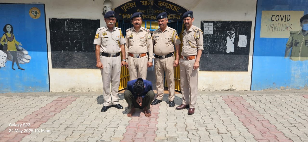 दिनांक 23-05-2025 को पुलिस थाना कंडाघाट की टीम द्वारा एक वांछित अपराधी Sharafat Khan, पुत्र श्री Rulah, निवासी गांव मुंडेट खादर, डा०खा० मुंडेट खास, तहसील उन, थाना भवन, जिला शामली, उत्तर प्रदेश, उम्र लगभग 60 वर्ष को Shamli, Uttar Pradesh से गिरफ़्तार किया गया।