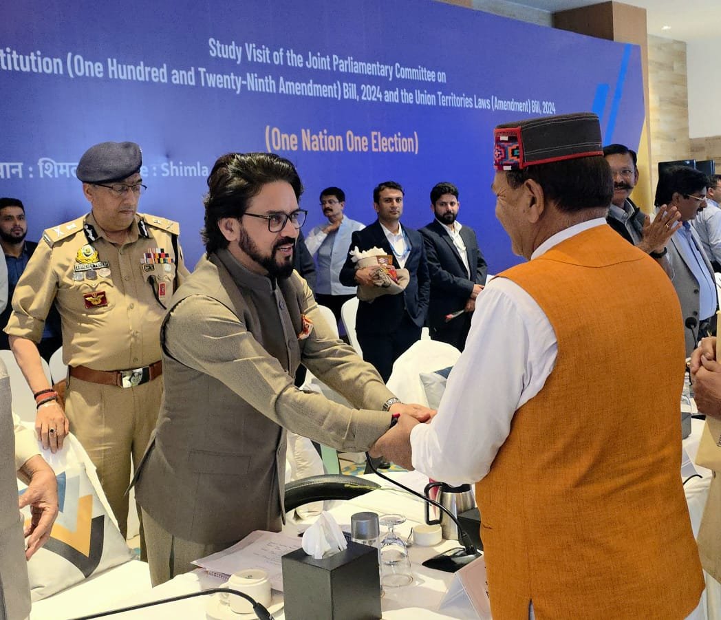 शिमला : पूर्व केंद्रीय मंत्री, हमीरपुर लोकसभा क्षेत्र से सांसद व एक राष्ट्र एक चुनाव पर संयुक्त संसदीय समिति (जेपीसी) के सदस्य श्री अनुराग सिंह ठाकुर ने समिति अन्य सांसदों के साथ शिमला प्रवास के दौरान विभिन्न आधिकारिक बैठकों में वन नेशन वन इलेक्शन की आवश्यकता व उपयोगिता पर अपने विचार रखे।दो दिवसीय शिमला दौरे के दौरान संयुक्त संसदीय समिति विभिन्न पॉलीटिकल पार्टी और तमाम हितधारकों से बातचीत कर रही है। शिमला में एक राष्ट्र एक चुनाव पर संयुक्त संसदीय समिति (जेपीसी) में मुख्यमंत्री श्री सुखविंदर सिंह सुक्खू, पूर्व मुख्यमंत्री व नेता प्रतिपक्ष श्री जयराम ठाकुर, भाजपा प्रदेश अध्यक्ष श्री राजीव बिन्दल, विधानसभा अध्यक्ष श्री कुलदीप सिंह पठानिया, डिप्टी स्पीकर श्री विनय कुमार, मुख्य सचिव श्री प्रबोध सक्सेना, श्री कमलेश कुमार पंत, श्री देवेश कुमार, श्री शरद कुमार लगवाल, श्री अजय शर्मा, श्री आशुतोष गुप्ता, श्री विवेक कुमार मिश्रा, श्री विजय कुमार, श्री एस सहने