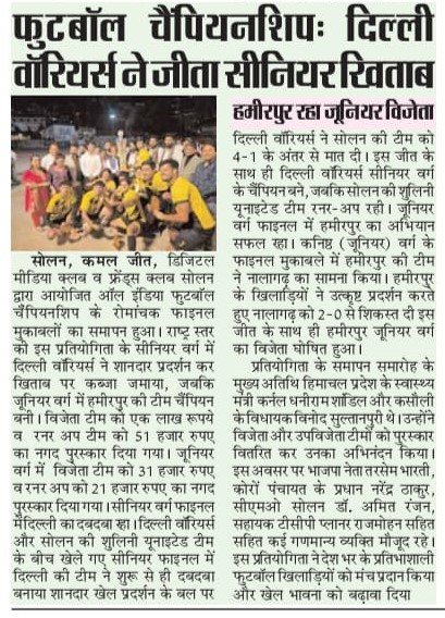 ऑल इंडिया फुटबॉल चैंपियनशिप: दिल्ली वॉरियर्स ने सीनियर वर्ग में मारी बाजी, हमीरपुर ने जीता जूनियर खिताब डिजिटल मीडिया क्लब...
