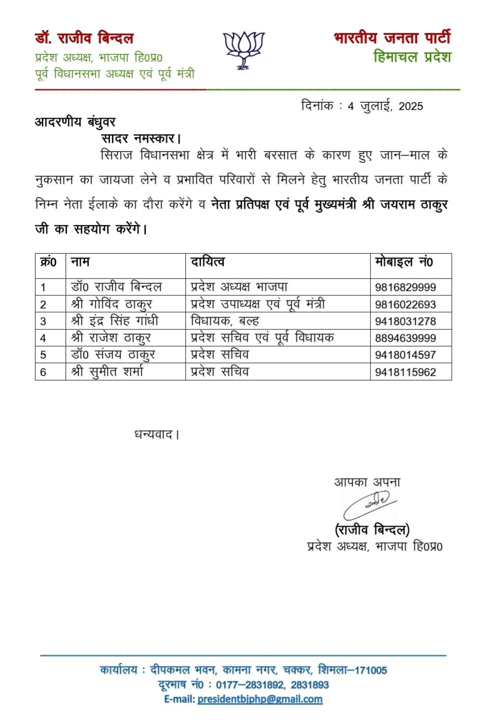 भारी बरसात के कारण हुए जान माल के नुकसान का जायजा लेने के लिए भाजपा की टीम निर्धारित •...